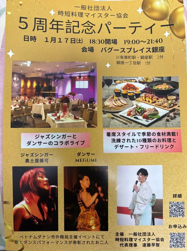 時短料理の普及と社会課題の解決に取り組む一般社団法人 時短料理マイスター協会は、2026年1月17日(土)、東京・銀座にて設立5周年を記念したパーティーを開催する。会場は、銀座LOFT地下に位置する洗練された空間「バグースプレイス」。