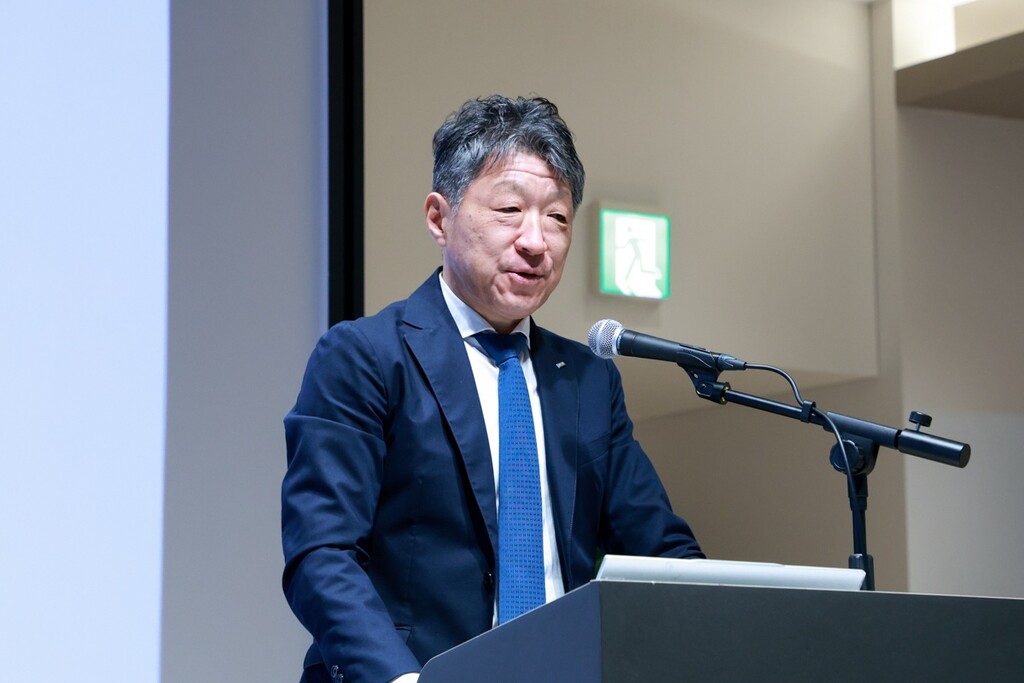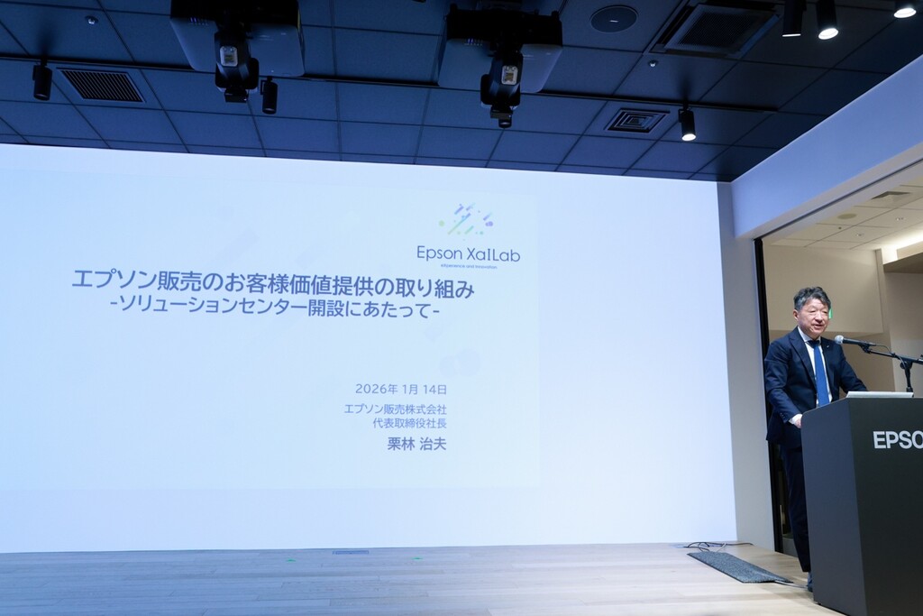 オープニングイベントにはエプソン販売株式会社 代表取締役社長の栗林治夫氏が登壇し、「Epson XaILab」開設の背景や施設に込めた狙いについて語った。