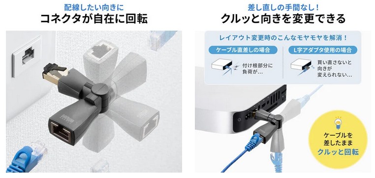 ■回転式LAN中継アダプタ「500-LAN6A-AD3D」