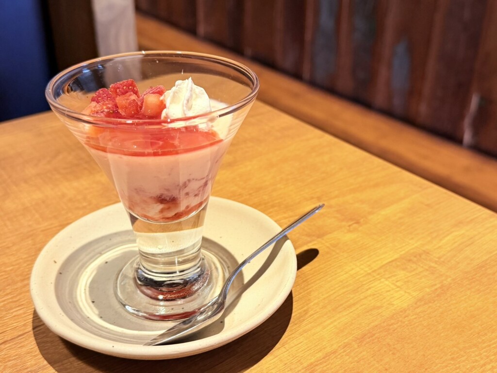 まず目を引くのは、白く艶やかなパンナコッタに、鮮やかな紅色の苺ソースが描くコントラスト。食後のテーブルに置かれた瞬間、自然と気分が切り替わる、季節感あふれる佇まいである。