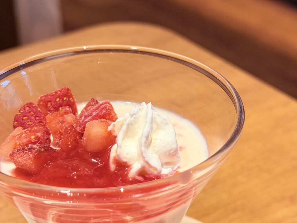 スプーンを入れると、驚くほどなめらかな感触。口に運べば、ミルクのコクがやさしく広がり、重さは一切感じさせない。そこへ重なる苺ソースの甘酸っぱさが、鍋料理で温まった口内をすっとリフレッシュしてくれる。酸味が立ちすぎず、あくまでパンナコッタのまろやかさを引き立てるバランス感覚が秀逸だ。