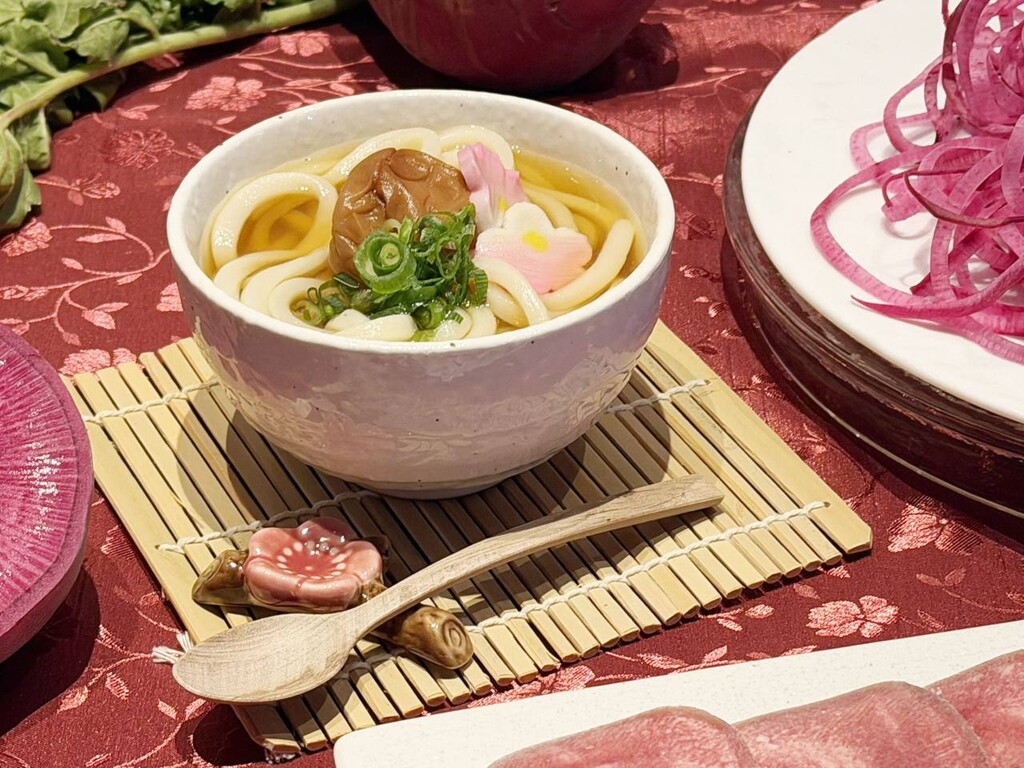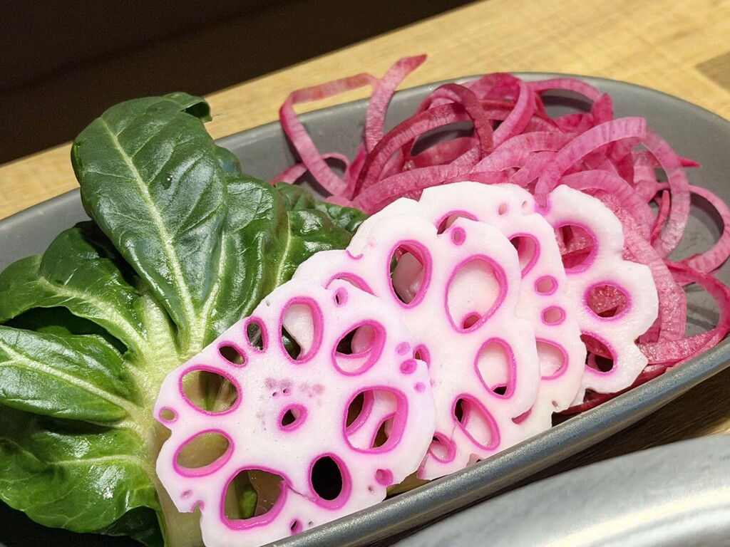 また、季節限定野菜として、紅色のミニ大根「紅くるり」や、花のような形が印象的な「梅花レンコン」、葉はやわらかく茎はシャキシャキ食感の「ターサイ」など、彩りや食感にもこだわった素材を取り入れ、見た目にも華やかな仕立てに。「紅くるり」はお鍋に入れることで、おだしが淡いピンク色に染まり、目でも楽しめる“紅白の変化”を演出する。