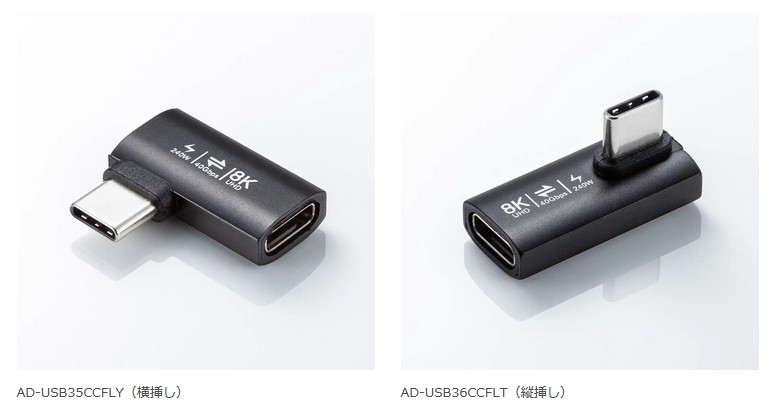 サンワサプライ株式会社は、L字型デザインで省スペースかつスリム設計のUSB Type-C変換アダプタ「AD-USB35CCFLY(横挿し)」「AD-USB36CCFLT(縦挿し)」を発売した。最大40Gbpsの超高速データ転送に加え、最大240WのUSB PD給電、8Kの高解像度映像出力に対応する。壁際などの狭い場所での配線や、機器からのケーブルの突き出しを抑えたい場面に最適だ。
