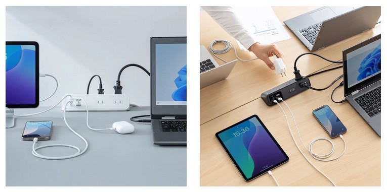 ノートパソコンやタブレットなど、様々な機器の電源を一括で確保できる。配線がばらけず一箇所にまとまるので、デスクの上がすっきりする。