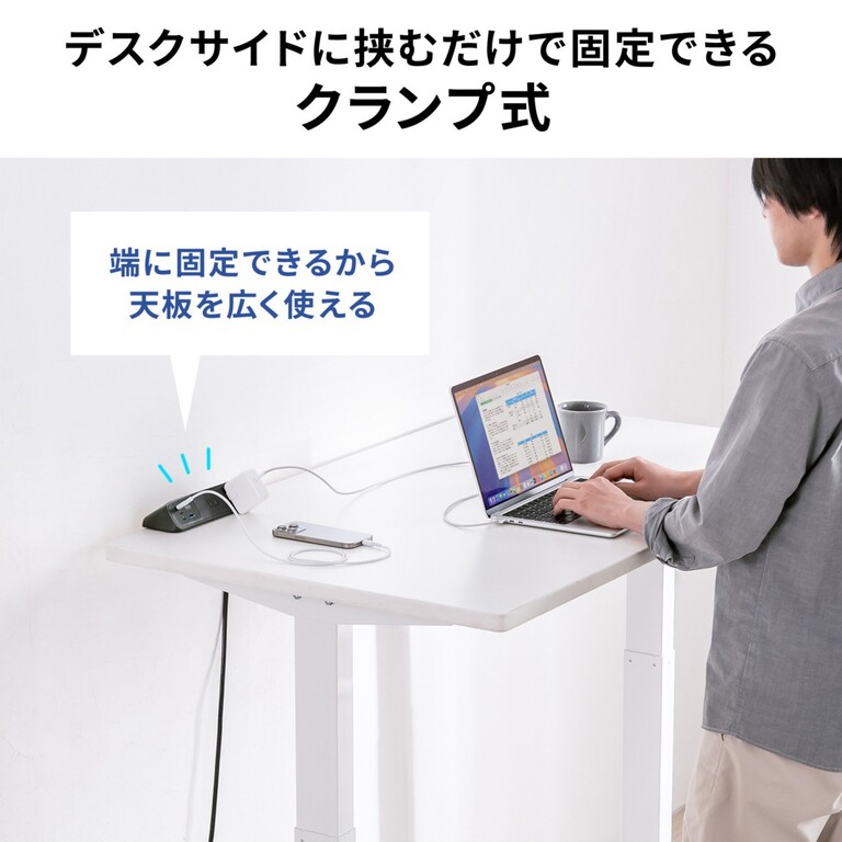 デスクに穴を空けずに設置できる。縁に沿わせられるので、デスク上のスペースを圧迫しない。しっかりと固定できるので、足や椅子をひっかけてタップごと落下するリスクも低減する。※クランプ固定金具は取り外しできない。