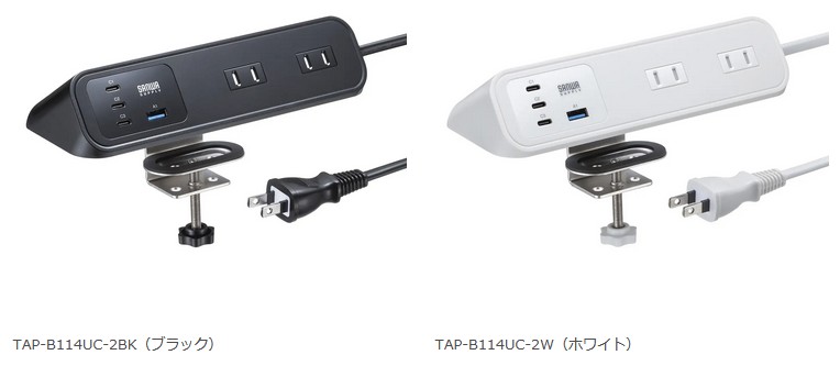 サンワサプライ株式会社は、デスクの縁にしっかり固定でき、最大65WのUSB PD出力に対応したクランプ固定式タップ「TAP-B114UC-2BK(ブラック)」「TAP-B114UC-2W(ホワイト)」を発売した。ノートPCの充電が可能なUSBポートと、抜き差ししやすい斜め設計のAC差込口を備え、デスク上の電源環境を改善する。2メートルのロングコードのため、離れた電源からでも柔軟に配線できる。