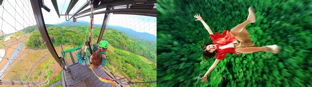 約20mの高さで、宙吊りにされている状態から突然フックが外され背中から真っ逆さまに急落下。まさに全てから開放され、重力だけに身を委ねる。勇気を振り絞って挑戦したその先に見えるのは、視界全体に広がる南国の真っ青な空。ネットにやさしく包みこまれ着地した、この極限のスリルと興奮がやみつきに。