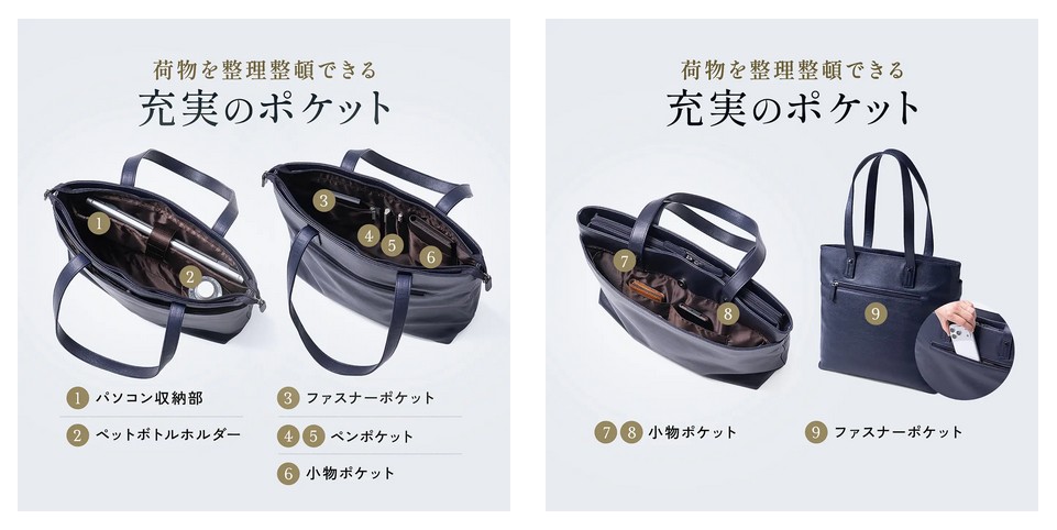 容量は約15L。ノートPC、書類、ペットボトル、折りたたみ傘まで、日常に必要なアイテムをしっかり収納できる。バッグの中でものが迷子にならないよう、9つのポケットを配置。忙しい朝でも、必要なものをすぐに取り出せる快適さを実現した。