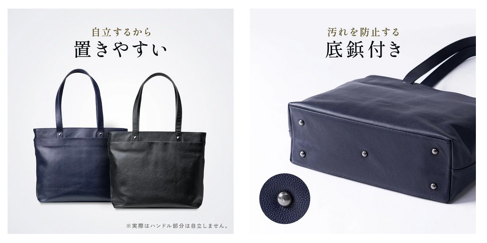 底板入りで自立しやすく、床に置いても型崩れしにくい設計だ。さらに4点の底鋲を備え、汚れや擦れを軽減する。ハンドルは肩掛けしやすい長さで、コートの上からでも快適。内側には色写りしにくい合皮を採用し、実用的にも妥協しない。