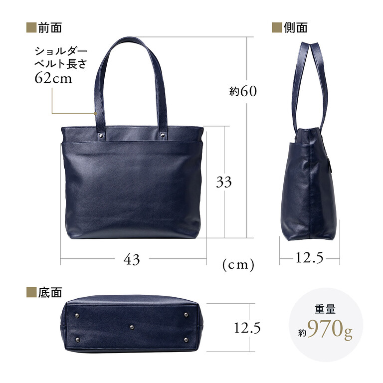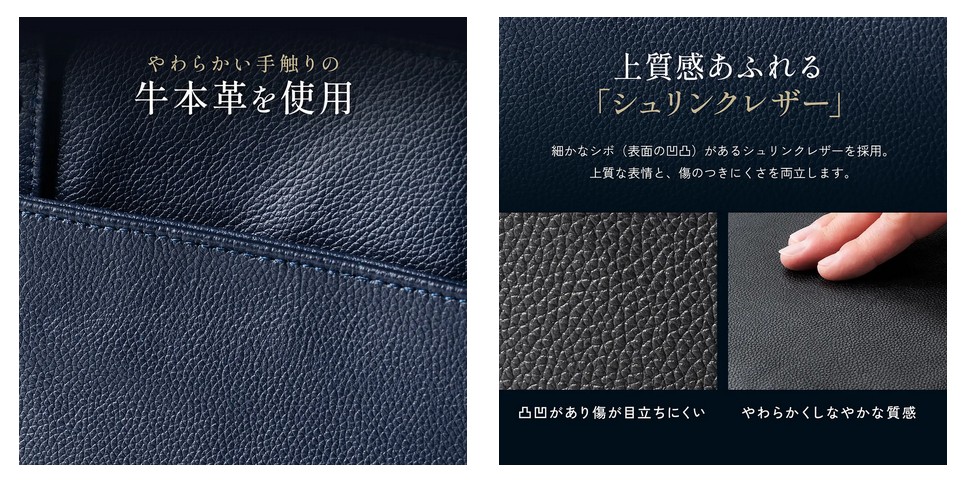 やわらかくしなやかな牛本革を使用した本製品は、手に取った瞬間に上質さを実感できるトートバッグ。表情豊かなシュリンクレザーが、傷を目立ちにくくしながらも自然な高級感を演出。ビジネスシーンでもプライベートでも、持つ人の印象をワンランク引き上げてくれる。