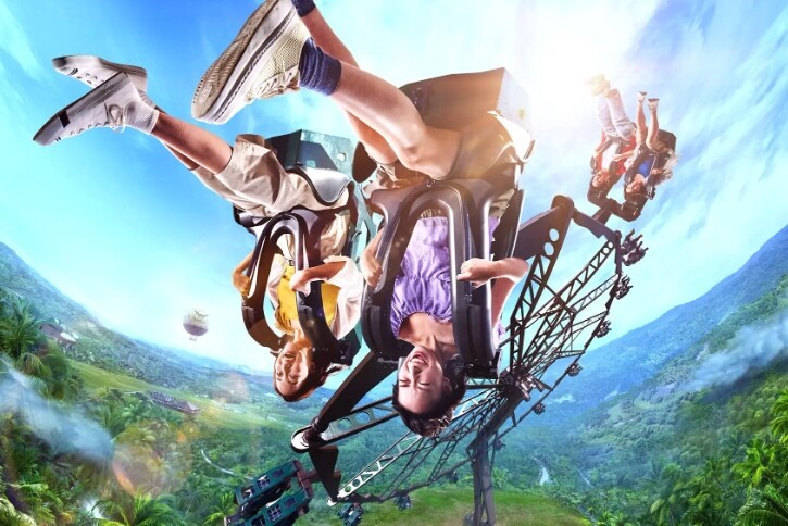 やんばるの渓谷が広がるジャングル エクストリームズエリアに登場する本アトラクションは、ライド直径約16m、最大高度約20mを誇るパーク屈指の大型ライド。回転しながら大きく傾き、最高到達点では体が逆さまに。
