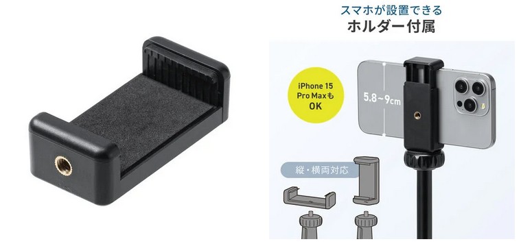 標準的な1/4インチネジに加え、幅58〜95mmのスマートフォンに対応する専用ホルダーを付属している。デジタルカメラやビデオカメラだけでなく、普段お使いのiPhoneやスマートフォンをそのまま装着して安定した撮影が楽しめる。これ一台で、SNS用の動画撮影から本格的な記念写真まで、デバイスを問わず幅広く活躍する。