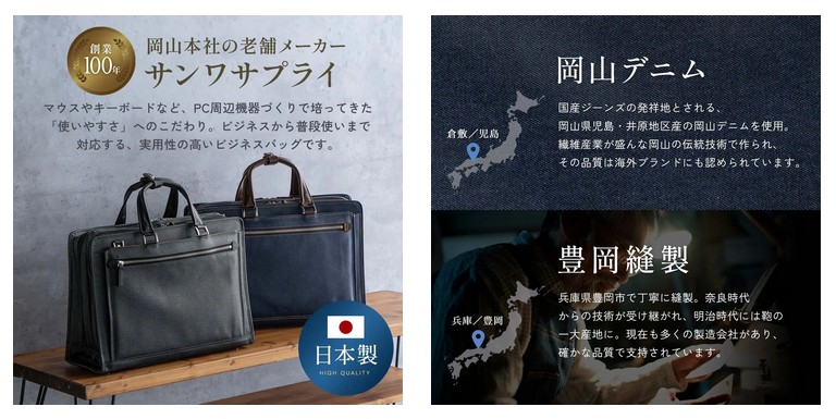 サンワサプライ株式会社が運営している直販サイト『サンワダイレクト』は、岡山デニム×豊岡縫製の組み合わせで仕立てた、高品質な日本製ビジネスバッグ「200-BAG185BK(ブラック)」「200-BAG185NV(ネイビー)」を発売した。
