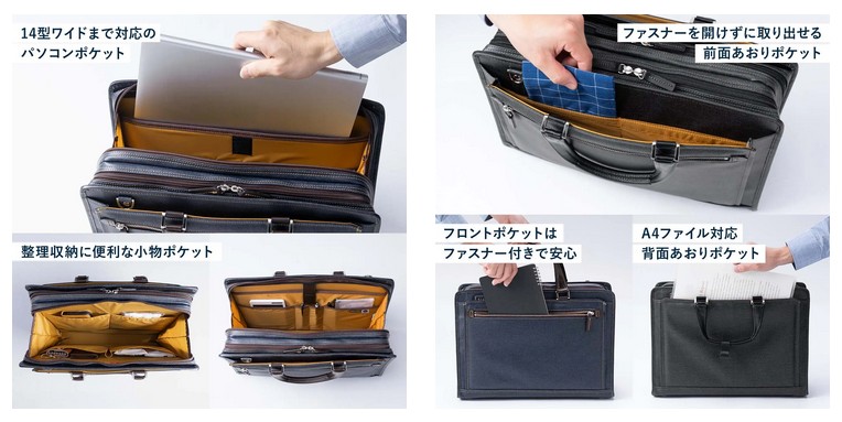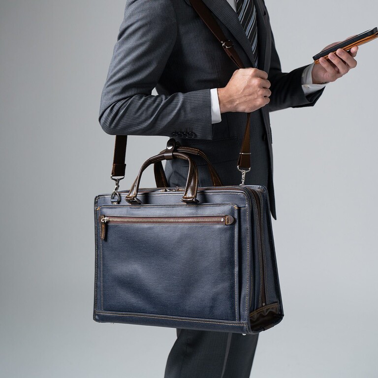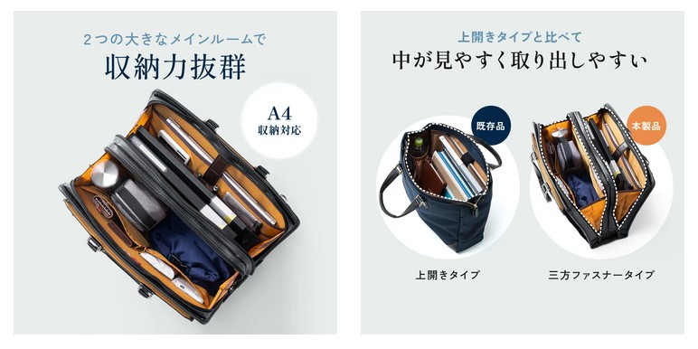 2つの大きなメインルームで収納力は抜群。A4書類はもちろん、必要なアイテムをまとめて整理できる。さらに三方ファスナー仕様で開口部が大きく開き、上開きタイプに比べて中身が見やすく取り出しやすいのも特長。移動中でも欲しいものにすぐ手が届き、商談前の準備やデスク脇での出し入れもスマートにこなせる。