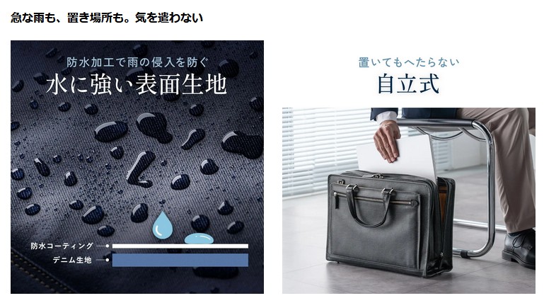 表面生地は防水加工済み。天候が読めない日でも気兼ねなく持ち歩ける。さらに、置いてもへたらない自立式だから、商談先やデスク脇でも“きちんと感”をキープ。床に置いた瞬間のだらしなさを回避し、立ち姿までスマートに見せてくれるのが嬉しいポイントだ。