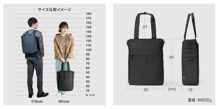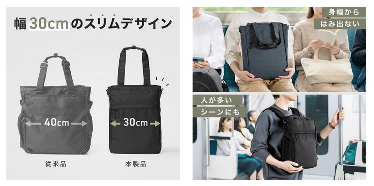 横に広いバッグは電車内で周囲に気を使いがち。本製品は横幅30cmの縦長デザインを採用し、身幅からはみ出しにくい設計だ。従来品より約10cmスリム化することで、混雑した車内でも隣席に当たりにくく、通勤・通学時の小さなストレスを軽減する。毎日の移動が快適になる、実用性を追求した形状を採用した。
