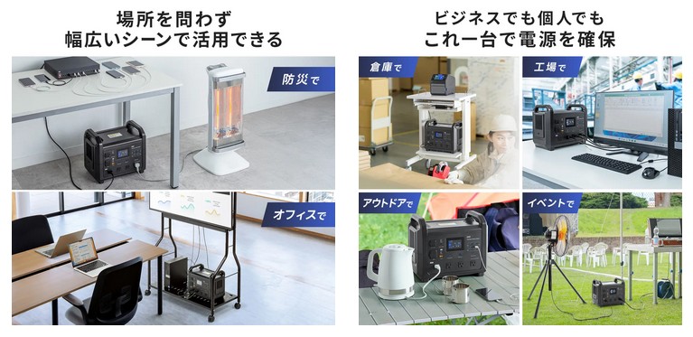 防災時の備えとしてはもちろん、オフィスや物流作業、イベント運営、アウトドアまで、場所を選ばずに安定した電力を供給できる、汎用性の高いポータブル電源だ。