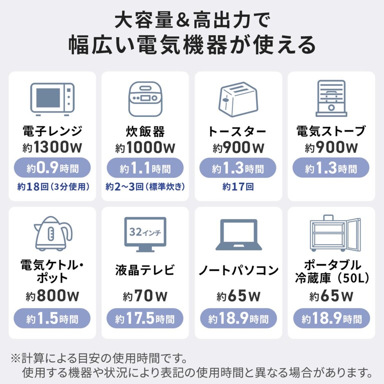 家庭用コンセント(最大1500W)と同等以上の最大1600WまでAC出力が可能な高出力モデル。パソコンやディスプレイだけでなく、電子レンジや暖房器具など消費電力の大きい機器にも幅広く対応する。
