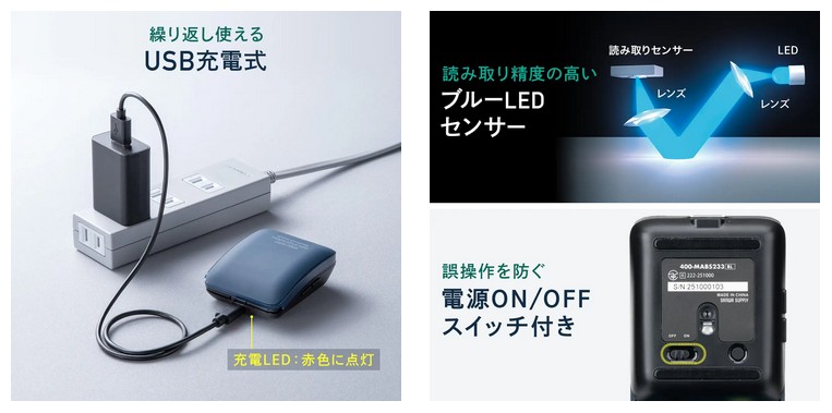 乾電池不要のUSB Type-C充電式で、連続作動時間は約50時間(満充電時の目安)。さらに電源スイッチ付きで、持ち運び中の無駄な電池消耗も防げる。充電ポートは正面に配置し、充電しながらの操作もしやすい設計に改善。付属のポーチとケーブルで、出張や通勤バッグでもきれいに持ち運べる。