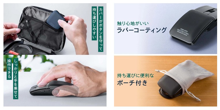 持ち運びに便利なポーチ付きの折りたたみBluetoothマウス「400-MABS233BK(ブラック)」