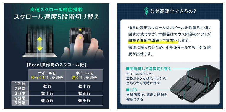 新搭載の高速スクロールは、用途に合わせて5段階で速度を切り替え可能。物理的にホイールが高速回転するわけではなく、ソフト的に高速スクロールを実装している。長いWebページ、PDF資料、表計算の縦スクロールなど、スクロール量が多い作業ほど時短効果を実感できる。移動中の限られた時間でも「スクロール」が速くなり、作業テンポがぐっと上がる。