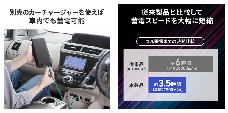 付属のType-Cケーブルでバッテリー本体に蓄電でき、専用ACアダプタを持ち歩く必要がなく手軽に使える。また、USB PD対応カーチャージャーと付属のType-Cケーブルで、車内でもスムーズに蓄電できる。
