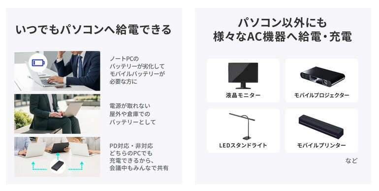 ACコンセントプラグを直接挿せる最大85WのAC出力ポートを搭載し、ノートパソコンへ給電できる。さらにUSB PD最大65W出力対応なので、付属のType-CケーブルでType-C充電対応パソコンへの給電も可能だ。