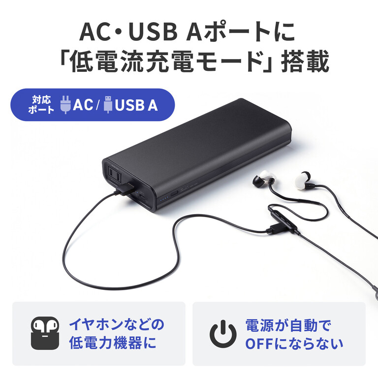 AC・USB Aポートは「低電流充電モード」に対応し、ワイヤレスイヤホンやウェアラブル機器などの充電電流が小さい機器でも、自動で電源が切れず安心して充電できる。※Type-Cポートは低電流充電モード非対応。