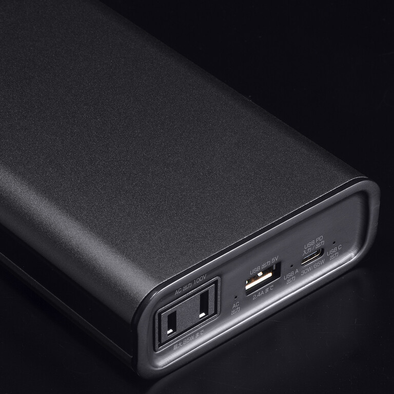 AC×1、USB A×1、Type-C×1と3種の給電ポートを搭載しており、様々な機器に対応する。容量27500mAh(並列換算値)の大容量モバイルバッテリーだ。