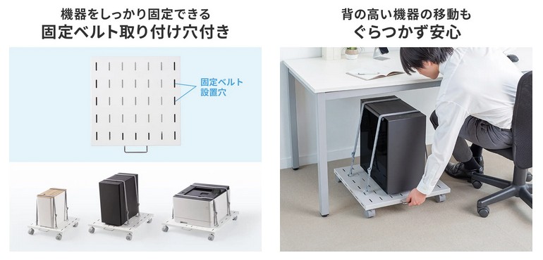 ■機器をしっかり固定できる固定ベルト取り付け穴付き