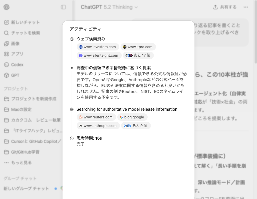 ChatGPTの裏で行われる動作をちょっと覗くことができるようになっている。「考え中」16秒間の間に、Webを検索したり、提案の中身をいろいろ試行錯誤したりしているのがわかる。まるで人間のようである。