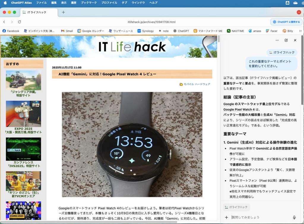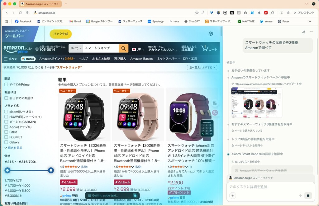 Perplexity Cometを使ってAmazonでスマートウォッチのお薦め機種を調べてもらっているところ。こちらも画面の右端にチャット欄があり、AIにブラウザの操作を依頼できる、とても未来感のある機能だ。AIが実際に画面を「見て」、操作してくれる。画面の一部が青くなっているのは、AIが操作中であることを表現している。ただ、現時点ではAIの画面操作の精度や、動作速度にはまだ不十分な印象が残り、まだこれからの技術と言えそうだ。