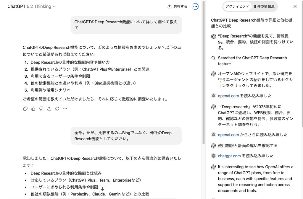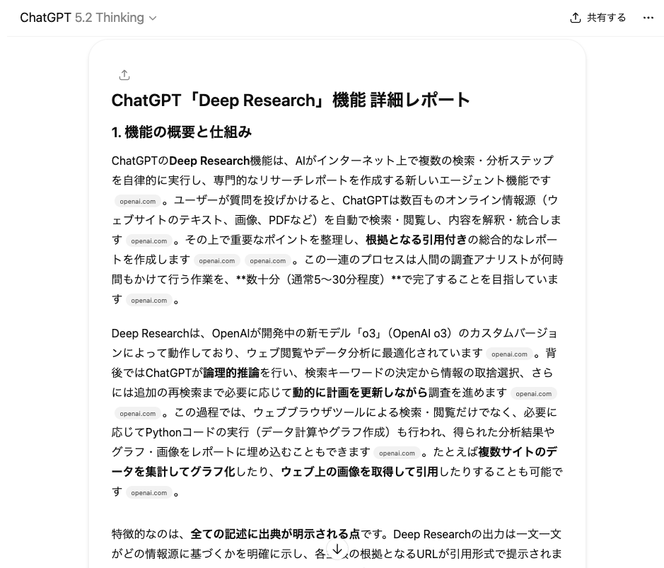 まずは「Deep Research」と呼ばれる自律的なリサーチ機能である。「最近の生成AIのトレンドを、過去のデータと比較して10ページ程度のレポートにまとめて」と一言頼めば、AIは即座にネットの海へと潜る。膨大なサイトを巡り、矛盾を排除し、情報元まで明記した完璧な報告書を作り上げてくれるのだ。人間が検索で何時間もかかっていた作業を、AIが黙々と裏で進めてくれる姿は、まさに24時間働き続ける勤勉な秘書のようだ。