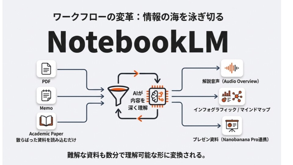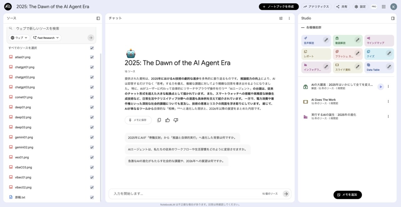 専門的な論文や大量の英文記事も、数分のうちに理解しやすい資料に落とし込める。NotebookLMでは画像生成機能として「Nanobanana Pro」が採用されており、生成された資料のビジュアル的な完成度は驚くほど高い。ワークスタイルを一変させるような、実に実用的なサービスである。
