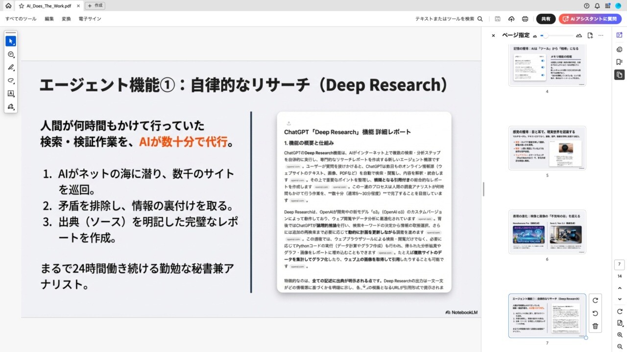 生成されたスライドの一部。とてもレベルの高いスライドが生成された。ただ、文字化けは同様に発生していることと、PDF形式であることは残念なポイントだ。PowerpointやGoogleスライド形式ではないため、自由に細かい編集ができない。内容や日本語の文字化けの修正の強いニーズがあるので、これも今後の改善に期待したい。