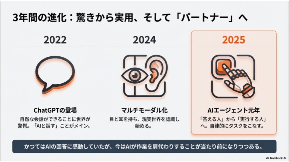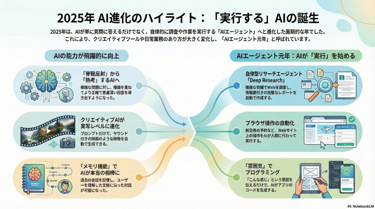 2025年の最も大きなパラダイムシフトは、AIが「答える人」から「実行する人(エージェント)」になったことだ。