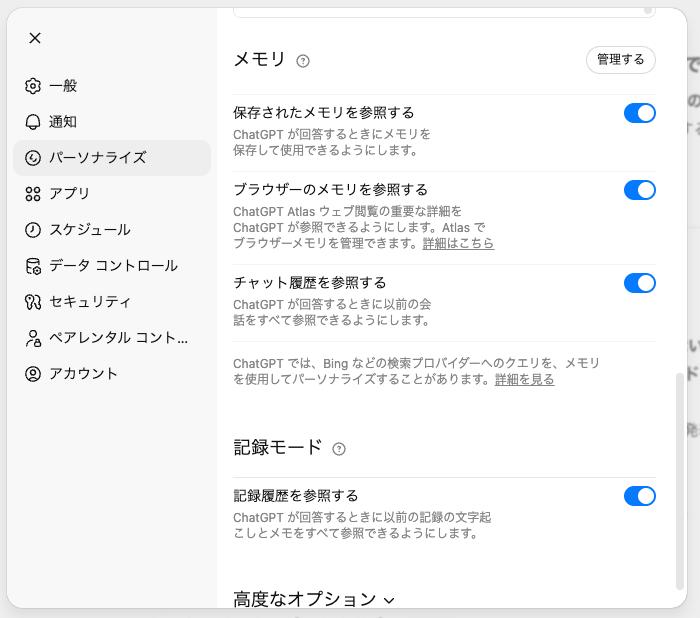 筆者のChatGPTの「メモリ」機能の設定画面である。ChatGPTとのやりとりの中でAIが必要に応じて内容をメモリに保存する。チャットのなかでユーザがしゃべったこと、たとえばどんな経験をしたか、どんな仕事をしたか、さまざまな好みなどもChatGPTが自然な形で覚えてくれる。そのため、ユーザが改めて説明しなくても過去の会話からの情報を元にチャットを進めてくれるようになった。「例の」とか、「いつもの」という会話が可能になるのである。プライバシーに関する項目になるので、オフにすることもできる。メモリの内容はユーザが確認したり修正したりも可能である。