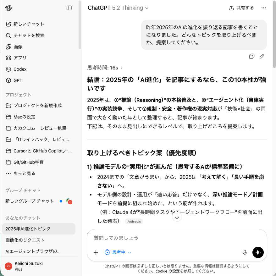 さらに、日々を共にする上で欠かせなくなったのが「メモリ機能」の搭載だ。筆者がかつて話した「来月は伊豆に行く予定だ」「仕事ではこんなプロジェクトを経験している」といった背景情報を、AIが自然に、そして正確に記憶している。以前のように、チャットを立ち上げるたびに関連情報を説明し直す必要はなくなった。この「自分を理解してくれている」という感覚が、AIを単なるツールから、本当の意味での「相棒」へと押し上げたと言えるだろう。