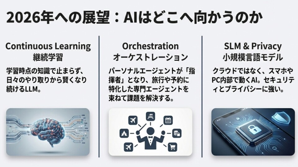 また、ユーザーを理解し先回りして提案する「パーソナルエージェント」の普及も期待される。複数の専門エージェントを指揮する「オーケストレーション」という仕組みにより、「いつもの」という言葉だけで複雑な課題を解決できる世界が近づいている。