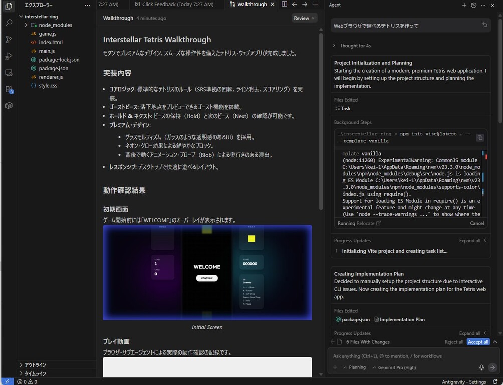 Google Antigravityを使ってプログラムを作ってもらう例。右端のチャット欄に「Webブラウザで遊べるテトリスを作って」とお願いしただけで、AIがすべてを計画し、必要ならユーザに確認する作業も行い、あっという間にテトリスを完成させてしまった。