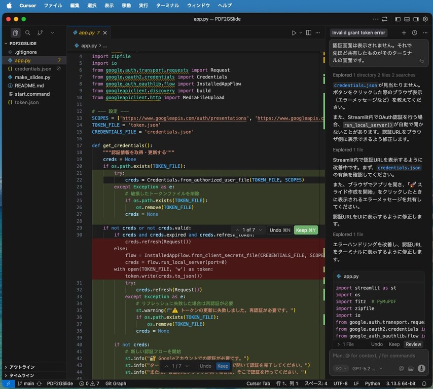 AI機能搭載エディタ「Cursor」を使ってプログラム開発をしているところ。右端のチャット欄でAIにさまざまな依頼をすると、それに応えて中央に表示されているプログラムを作ってくれる。プログラムコードの内容は専門的になるが、ユーザは必ずしもその内容を理解している必要はなく、AIがすべてを行ってくれる。プログラムにミスがあってエラーが出ても、それをAIに伝えるだけでAIが原因を調査し、修正してくれるのだ。専門知識がなくてもプログラム開発ができる時代が到来したのだ。