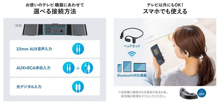 本製品は、面倒なBluetooth設定やペアリング操作が一切不要。ヘッドセットの電源を入れるだけで、すぐにテレビの音声がワイヤレスで楽しめる。機械操作が苦手な人や、高齢者でも直感的に使える設計で、家族みんなが安心して使えるテレビ用オーディオ環境を実現する。