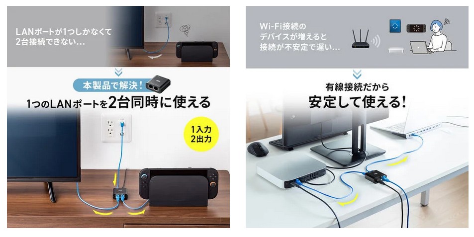 1系統のLANケーブルを2分配できる本製品は、限られた配線環境でも複数機器を有線接続したいシーンに最適だ。Wi-Fi環境が不安定な場所でも、安定したギガビット通信を確保。テレビとレコーダー、PCとゲーム機など、同時使用でも通信が途切れにくく、快適なネットワーク環境を実現する。
