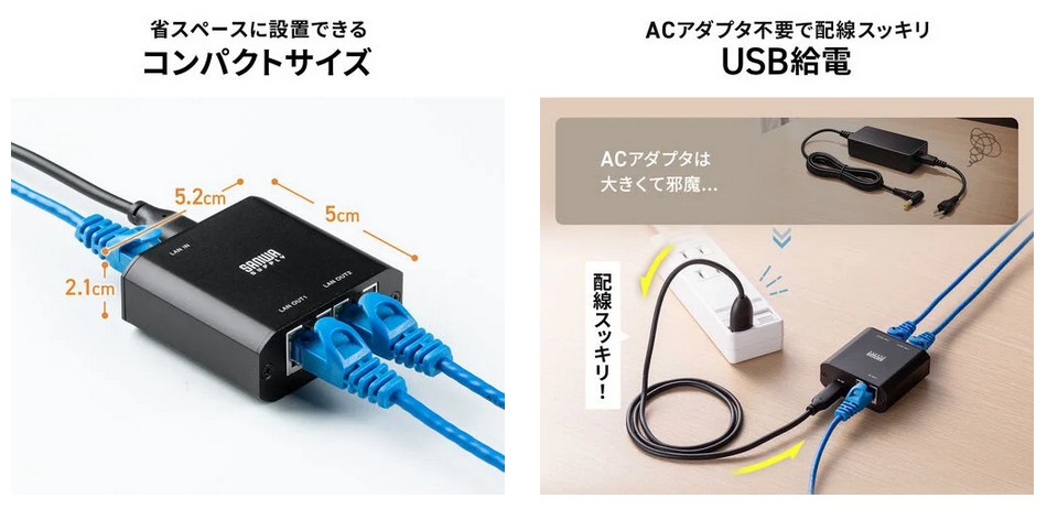 サンワサプライ株式会社が運営している直販サイト『サンワダイレクト』では、ギガビット対応でLANを2分配、Type-C給電で省スペース設置ができる超小型アルミ筐体スイッチングハブ「500-SWH012」を発売した。