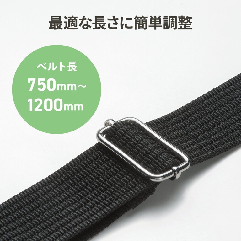 体格に合わせて、ベルトの長さを75cm~1.2mの間で調整することができる。