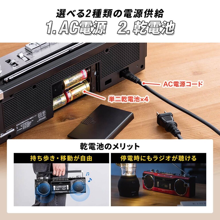 AC電源と単二乾電池×4本の両対応で、屋内外問わず使用可能。取っ手付きで持ち運びやすく、左右合計6Wのステレオスピーカーがしっかりとした音量と広がりのあるサウンドを実現。技適マーク取得済みで安心して使用できる。
