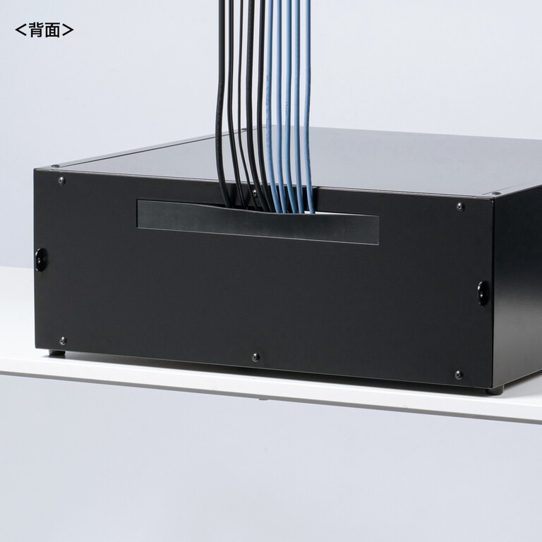 背面にケーブル口付きパネルを装備している。パネルを上下を反対にして取り付けることで、ケーブルの配線を上向きにも下向きにも設置できる。