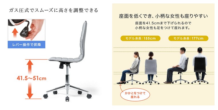 ロッキング機能は座面下のレバーでON/OFFの切り替えが可能だ。さらに硬さ調整ノブにより、体格や好みに合わせたセッティングが行える。座面の高さもガス圧リフト方式で簡単に調節でき、デスクや身長に合わせた最適なポジションを素早く実現する。