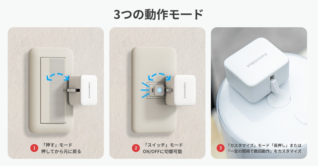 「押す」「スイッチ」「カスタムモード」の3つのモードで、基本的な動作からこだわりの設定まで対応。「カスタムモード」では、押し続ける時間や動作の間隔を細かく調整できるため、より多様な使用シーンで活用できる。