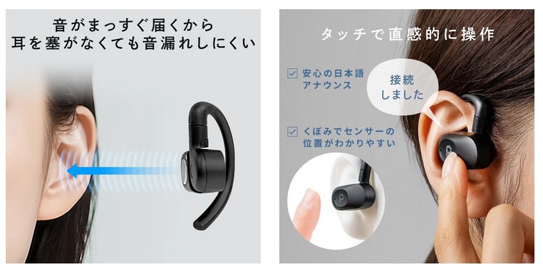 オープンイヤー型にありがちな音漏れを抑制し、カフェやオフィスでも使いやすい設計だ。ENC搭載マイクにより、騒がしい環境でもクリアな音声通話を実現。オンライン会議やテレワークにも最適です。タッチセンサーには“くぼみ”を設け、直感的な操作性にも配慮した。